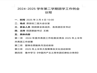 3月4日上午,院團委在技校樓二樓會議室召開2024-2025學年第二學期第一次工作例會。院團委全體成員、各系團總支、學生團總支副書記等人參加會議,會議由院團委副書記王娟主持。